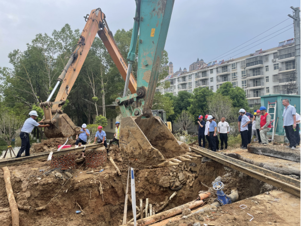 17日清晨開始,50余名各方人員和10余臺工程機械設(shè)備繼續(xù)增援、先后到場,現(xiàn)場邊排水邊開挖,并按照多套搶修方案分頭準備。