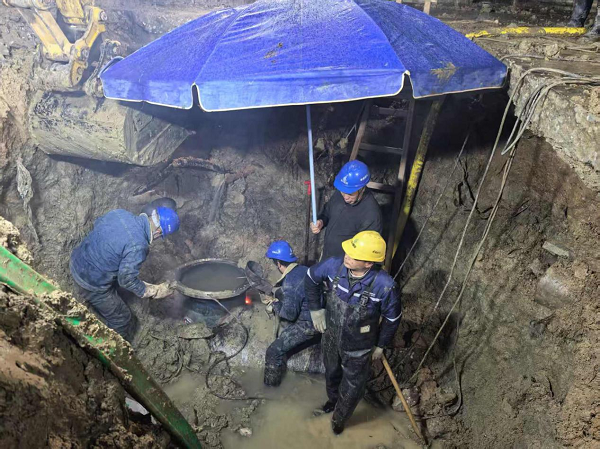 為將停水影響降至最低,運維部經周密研判,果斷決定將施工窗口期設定在深夜。技術人員連夜開挖探查,根據管道破損實際情況精準制定多套維修方案,最終克服技術難題,選定高難度的帶水作業方案,最大限度縮短停水時長。